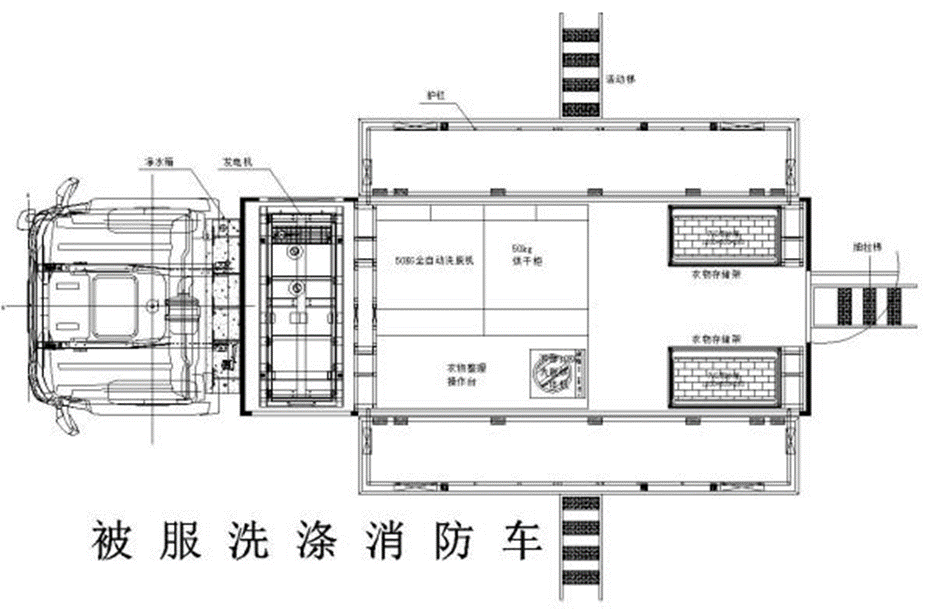 结合被服洗涤车实际情况,车内分为洗衣、储存区,发电区,晾衣、挂衣区,车 辆箱体中部宽敞,空间大,可以同时两名人员操作,提高效率;可对作训服、战斗服、