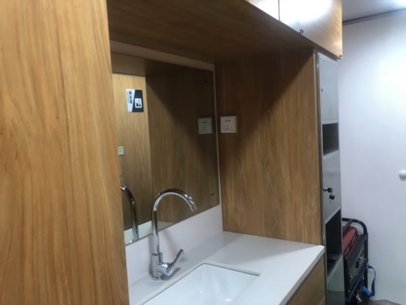 采用重汽ZZ2187N5227E1越野底盘进行改装,整车厢体采用厢式大板粘接结构,厢体表面采用铝合金板粘接,隔层采用现场发泡填充,确保厢体保温,保温层厚度均匀,填充饱满,具有抗老化耐腐蚀能力,防火性能符合相关规定,整体做防水处理。车内卫生间,充分保护个人隐私,每个隔间设计有照明灯、衣帽钩、换气窗。储物网兜等:地板为铝花纹板 专用防滑隔水垫。整车配备电器系统、厕所系统及设备系统:携带空调暖风机,220V电源系统,工业连接器,30米电缆线和线盘和专用设备插座,采用车船专用打包式蹲便器,适用于无水无电场所。自备电池组逆变电源充电机等。